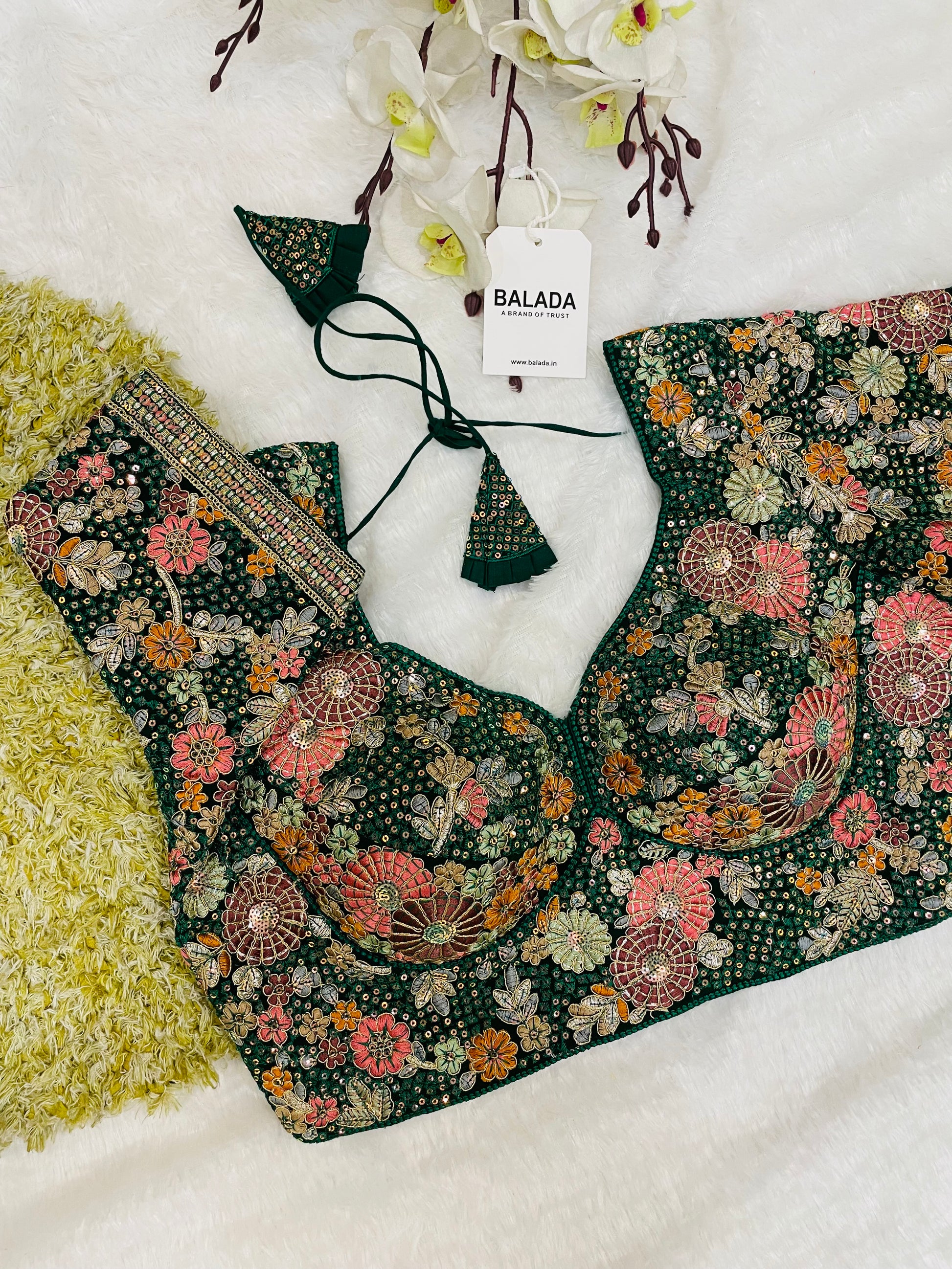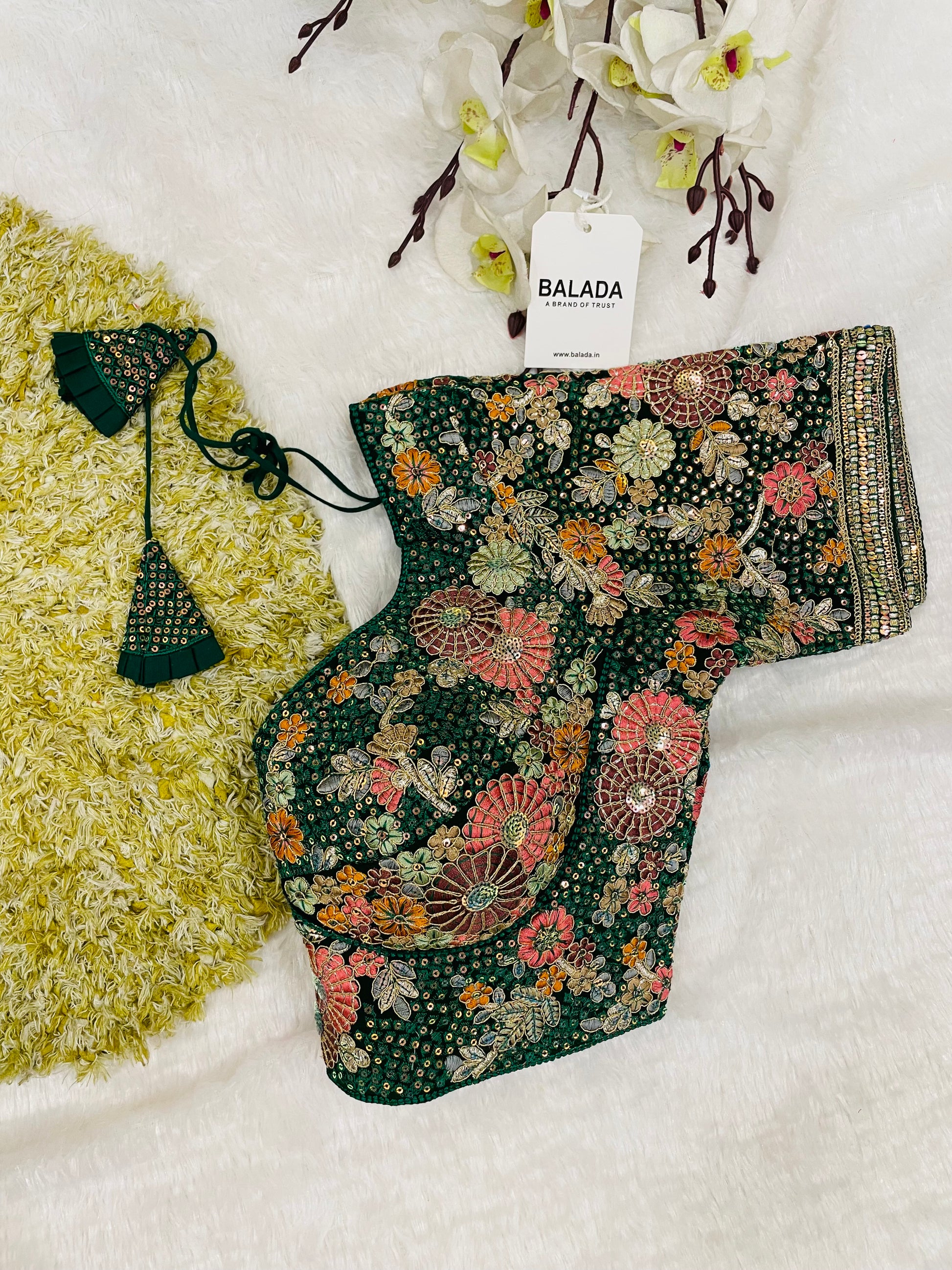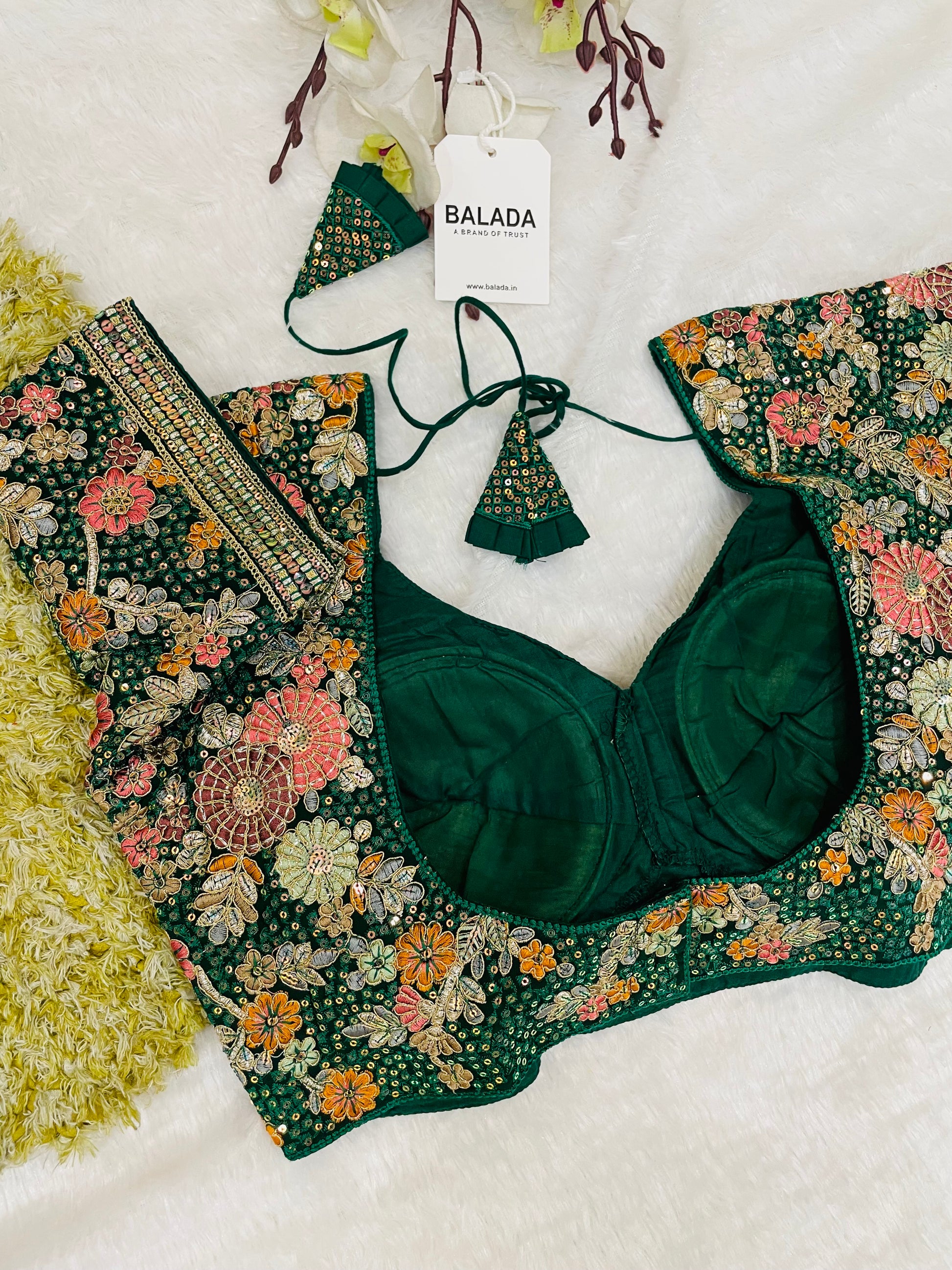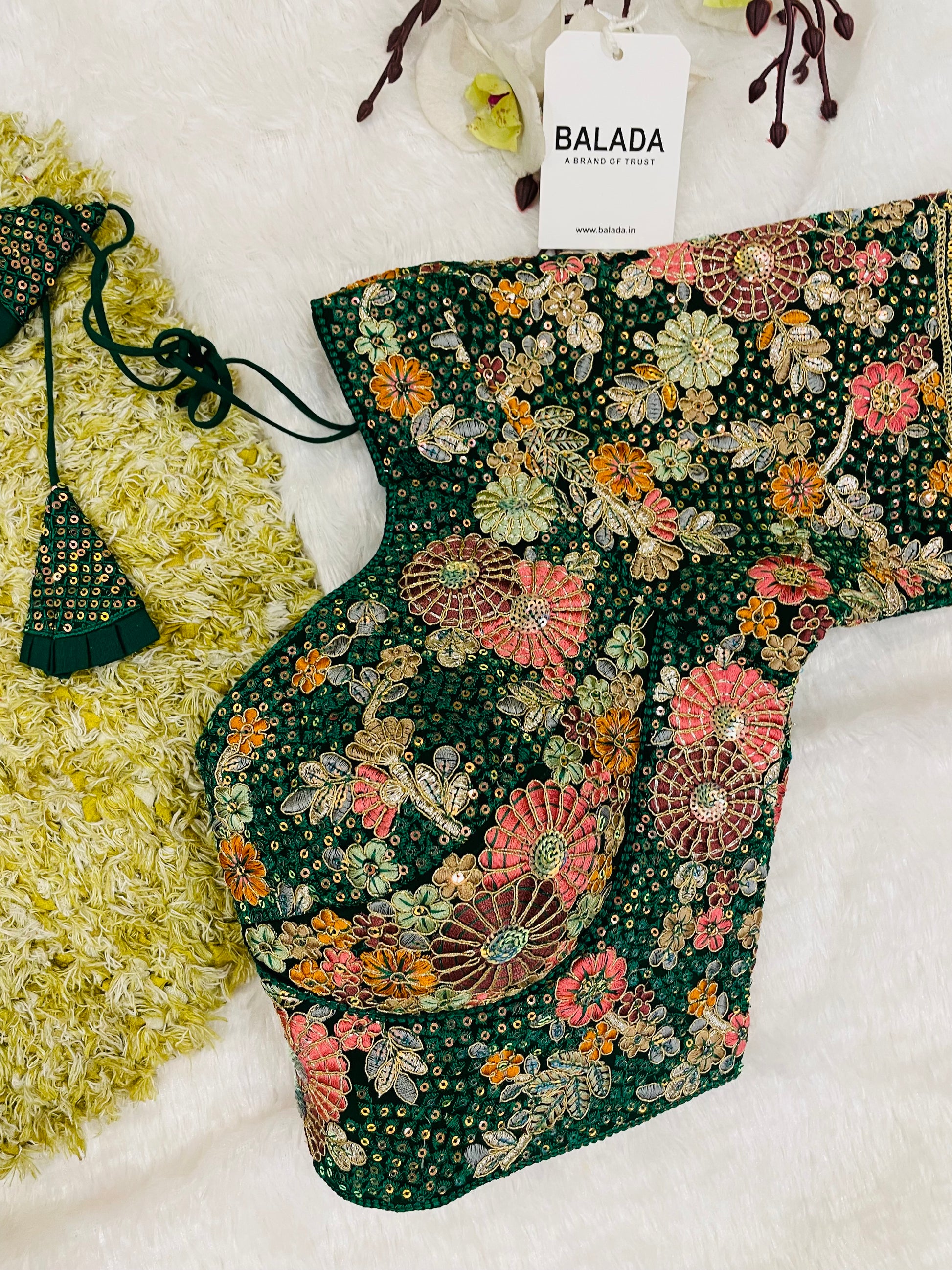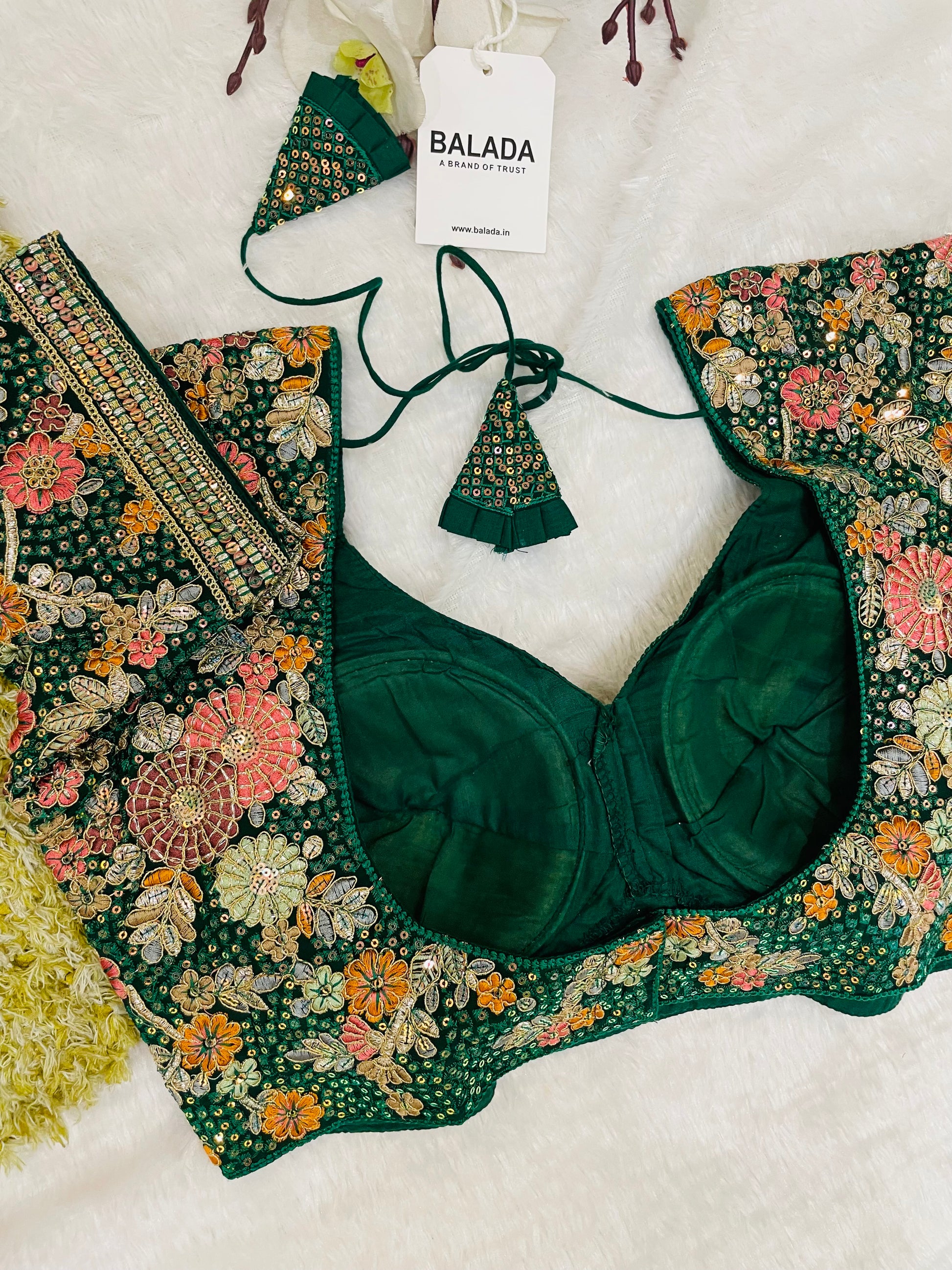 Step into elegance with this breathtaking emerald green silk blouse, featuring lavish hand-embroidered multicolor floral motifs and sparkling sequins for a dazzling festive look.