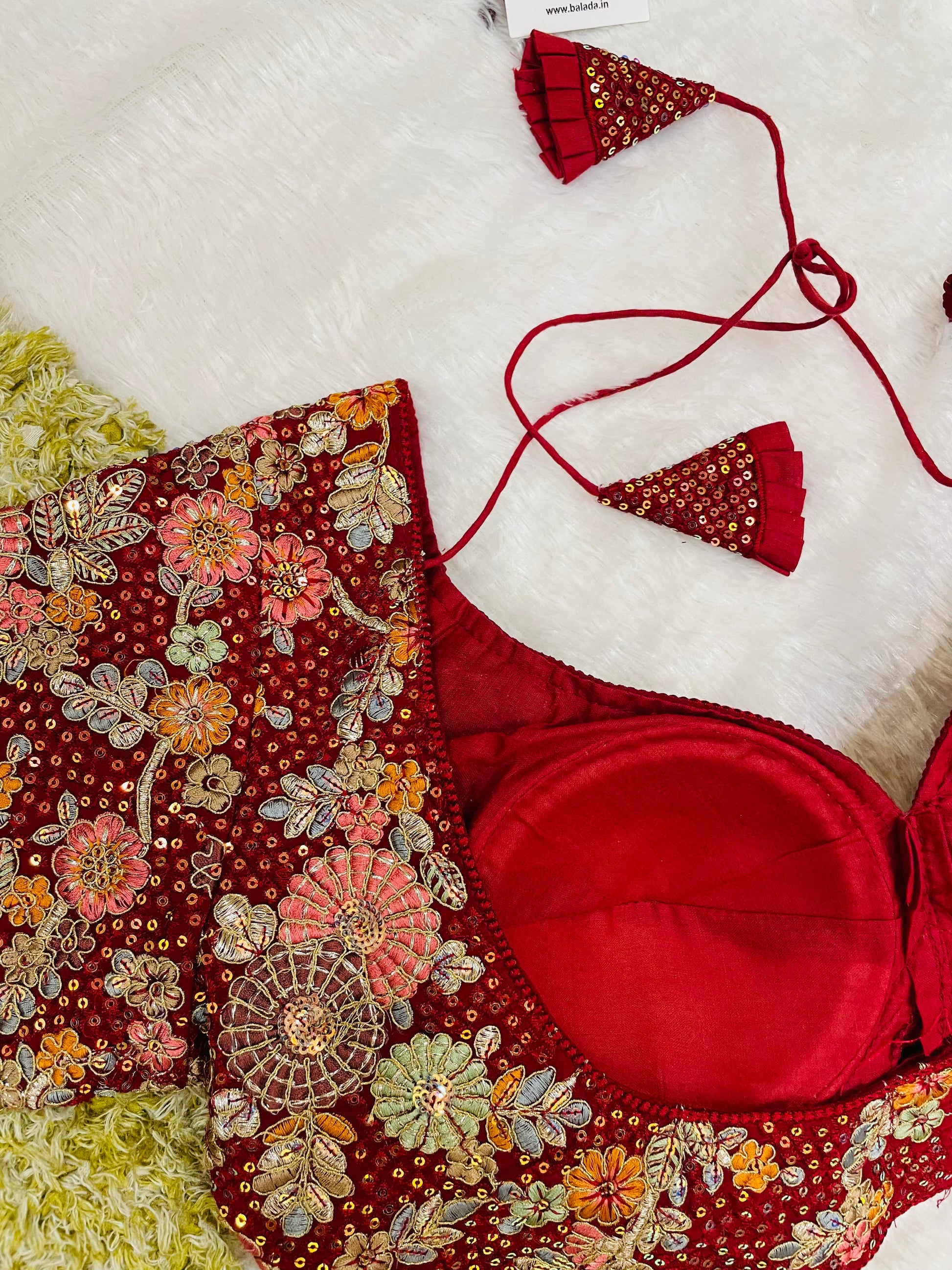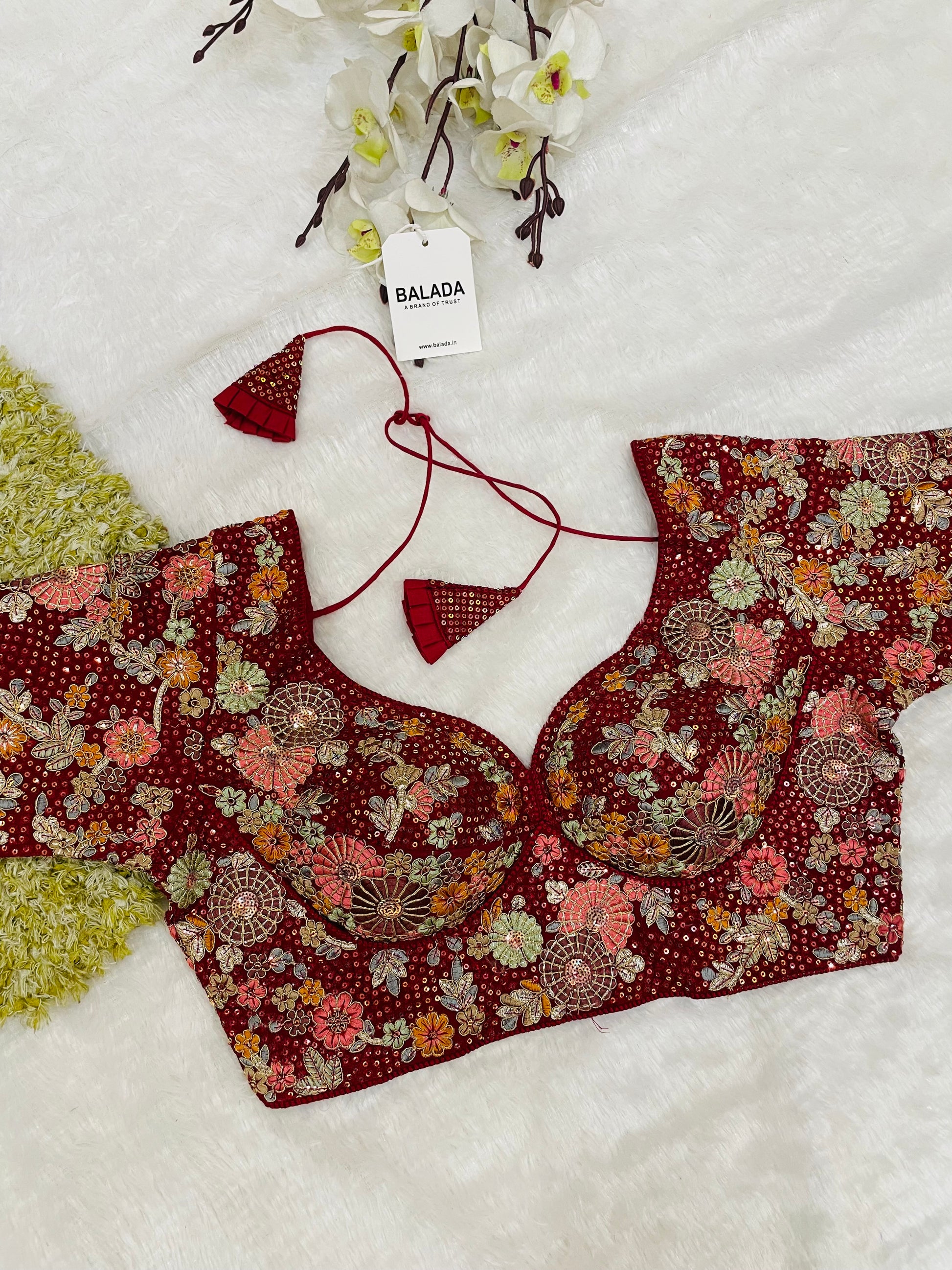 Step into elegance with this maroon heavy embroidered floral blouse, designed to make every festive and wedding look unforgettable. Its rich embroidery and classic design bring a luxurious ethnic charm.