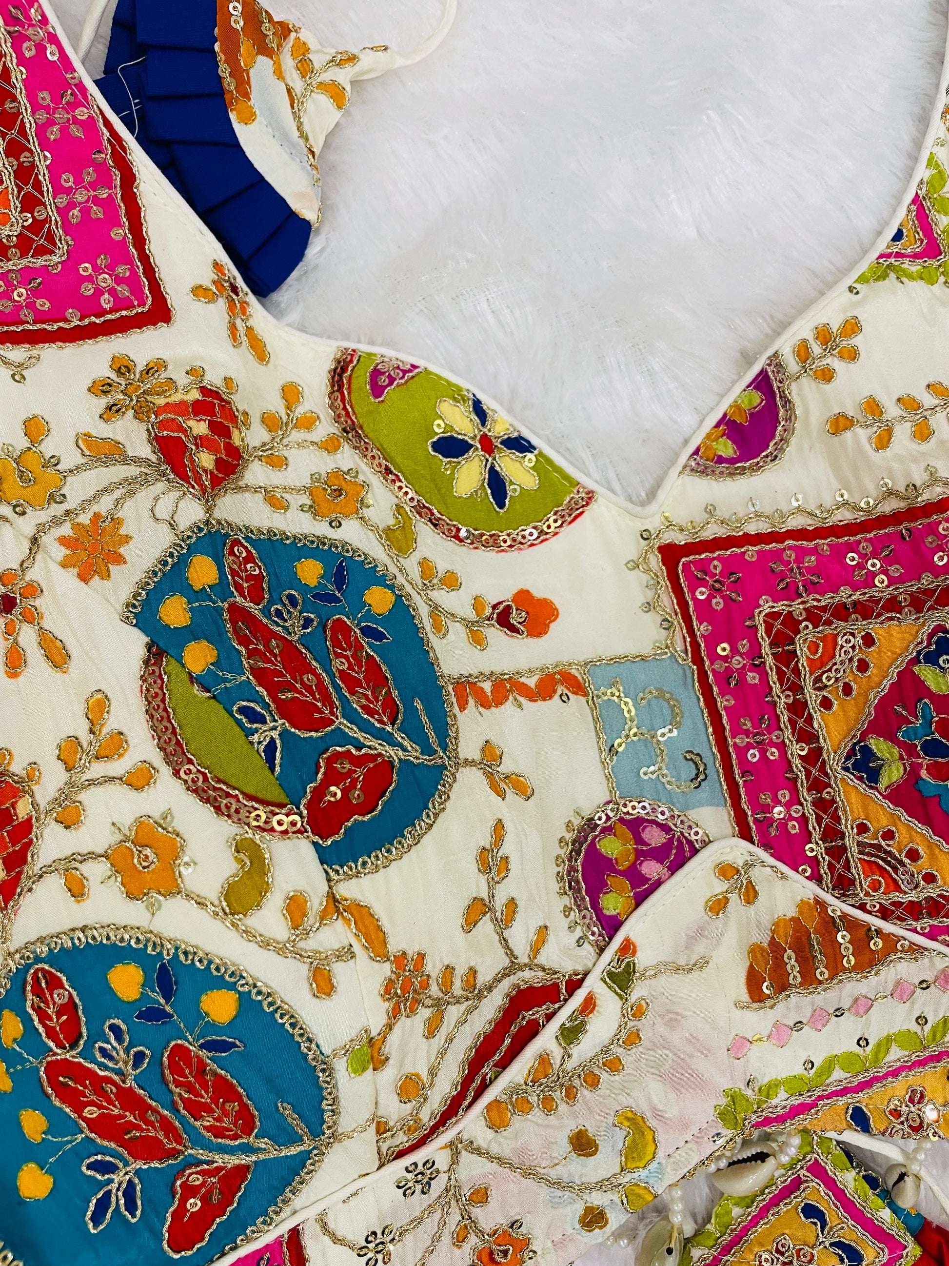 Elevate your ethnic style with this elegant off-white sleeveless embroidered blouse. Designed with colorful motifs and intricate detailing, it brings a perfect mix of traditional and modern charm.