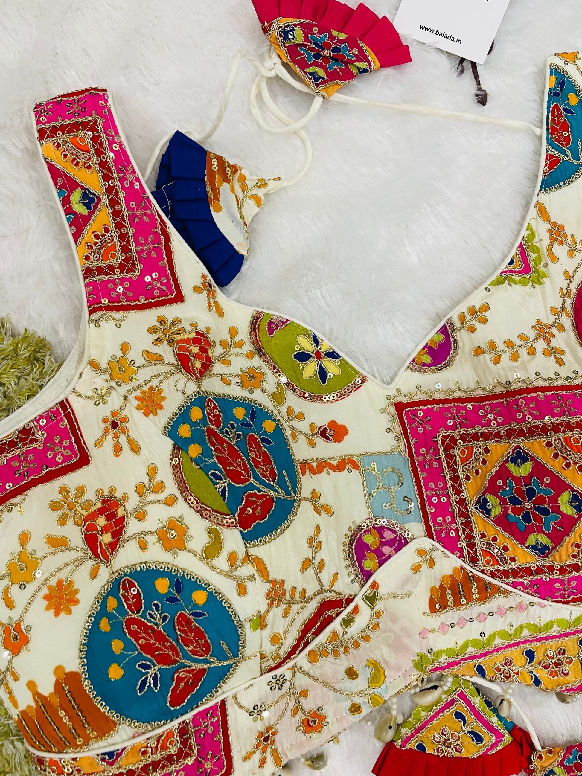 Perfect for pairing with lehenga, saree, or ethnic skirts, this blouse adds a classy yet vibrant charm to weddings, festive occasions, and parties.