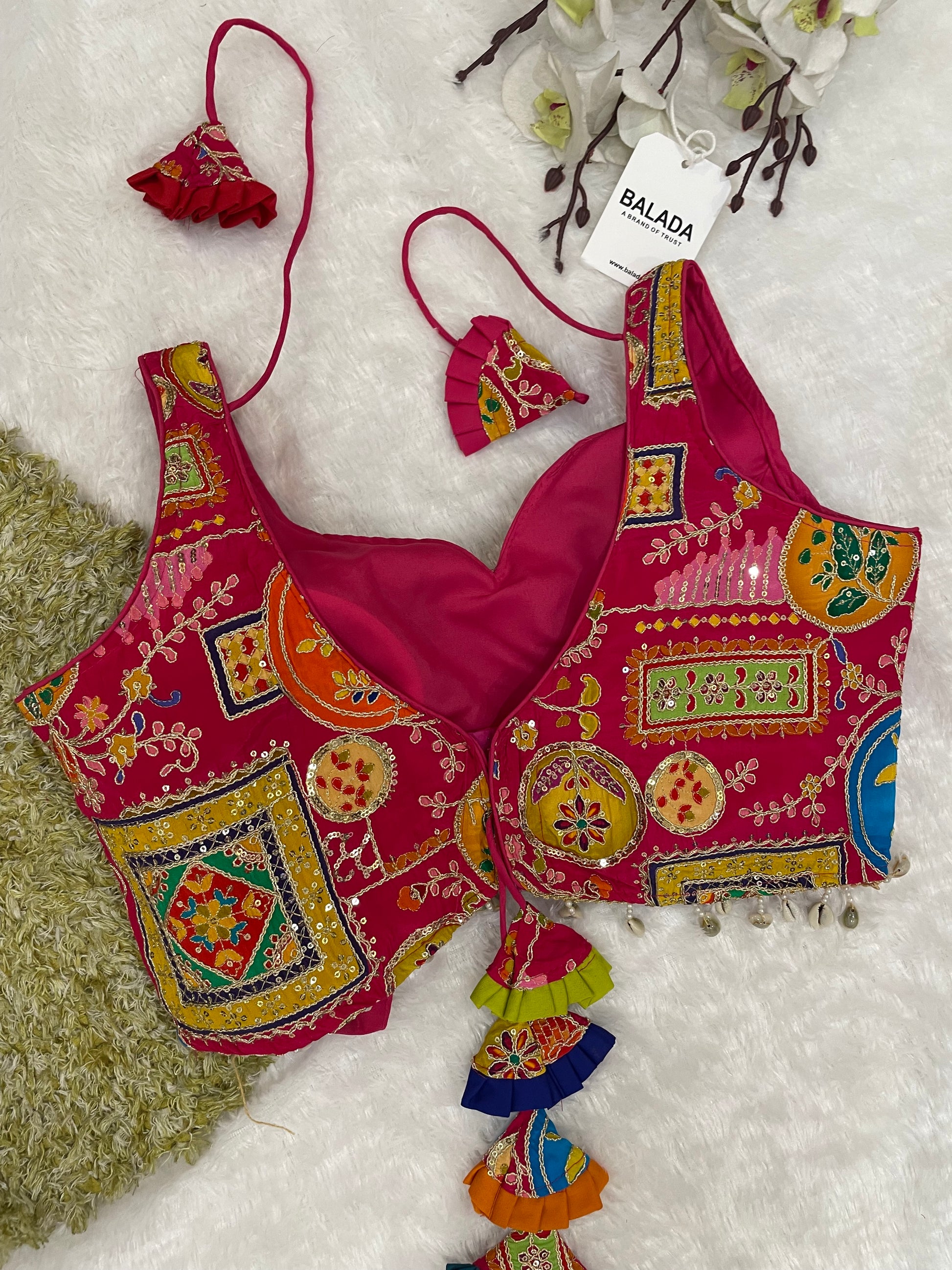 Make a bold style statement with this red sleeveless embroidered blouse, perfect for festive and wedding occasions. Its vibrant embroidery and colorful tassels add the right touch of tradition and elegance.